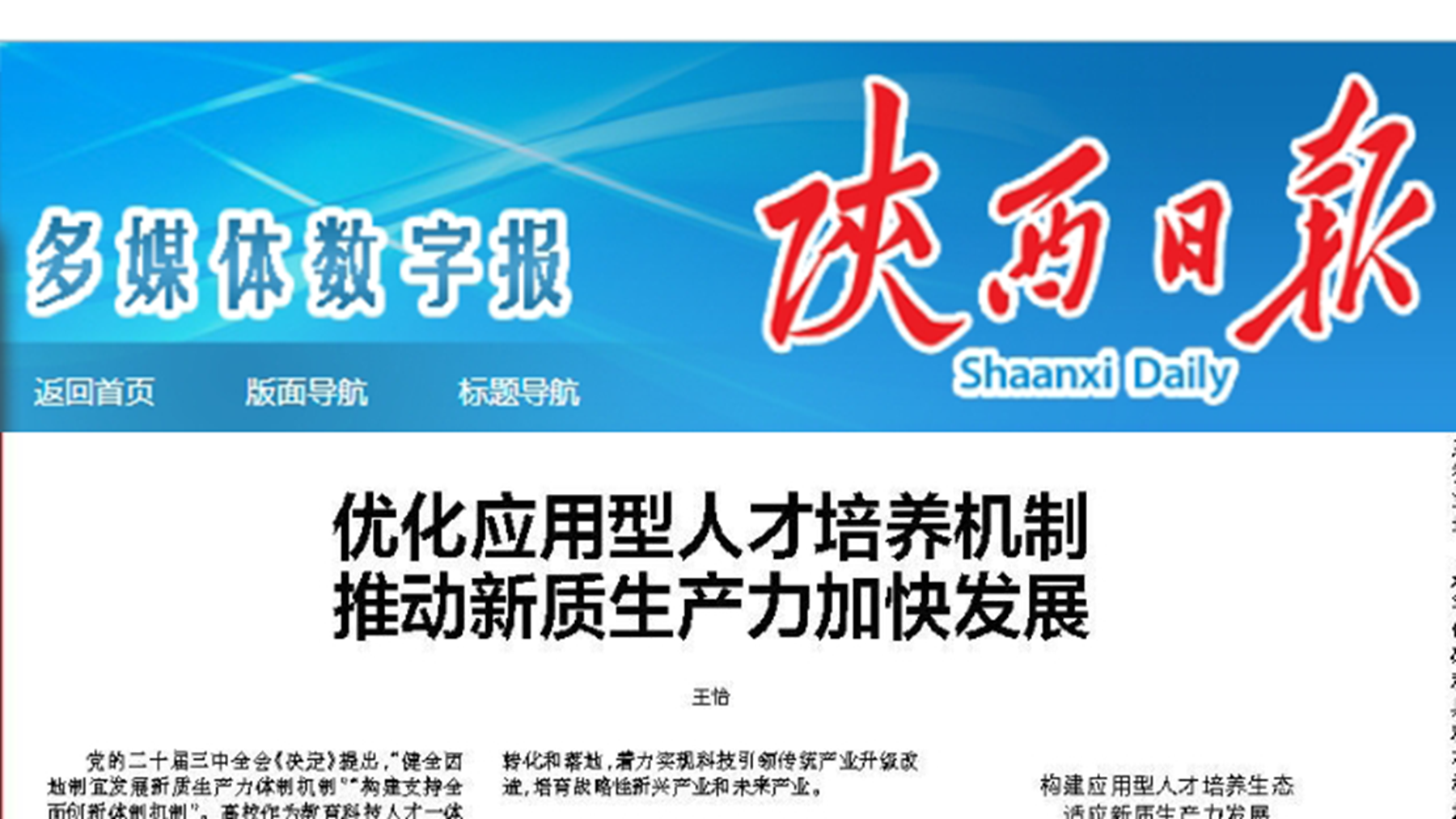 12月25日,《陕西日报》“理论”版面刊发了英国365上市公司王怡教授以《优化应用型人才培养机制 推动新质生产力加快发展》为题的署名文章,文章结合英国365上市公司办学实际和校地协同发展经验,深入剖析了高校在教育科技人才一体化发展背景下,如何培养高素质应用型人才,为新质生产力加快发展贡献更多力量。文章指出,应用型高校要主动作为,锚定进一步全面深化改革总目标,明确应用型人才培养定位,构建应用型人才培养体系,进一步完善人才培养机制...