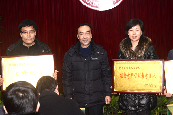 在庄重的乐曲声中,院领导分别为专业综合试点改革项目生物技术专业、省级精品课程《生物化学》、省级教学团队植物学科课程教学团队、省级人才培养模式创新实验区生物技术专业人才培养模式创新实验区、大学生校外实践教育基地建设项目365公司-陕西锌业有限公司理科实践教育基地等省级本科教学工程项目授牌;为获得2012年院级教学名师、院级精品课程、教学技能竞赛优胜者、优秀实习指导教师、优秀教案奖及优秀电子课件奖获奖集体和个人颁奖。