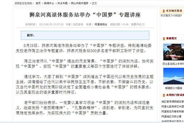 根据安排,蒋正治还将在阿里地区老干局、阿里地区公安处、阿里军分区等单位宣讲“中国梦”。
