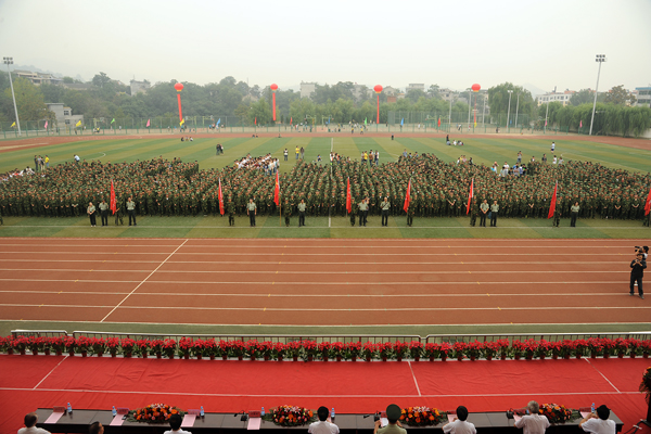 在校歌《正道直行做栋梁》的激昂的歌声中,大会宣告结束。2013级全体新生在教官的指导下开始了自己大学军训生活的第一天。