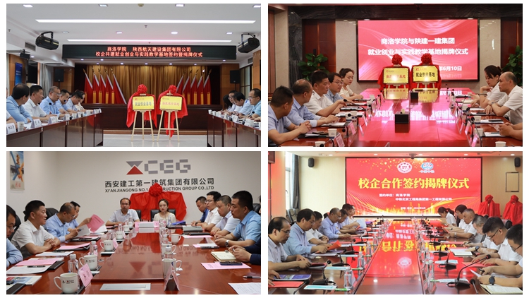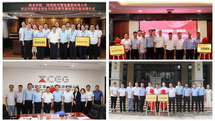 范新会分别与陕西航天建设集团有限公司总经理王明虎,陕西建工第一建设集团有限公司工会主席、纪委书记袁勇,西安建工第一建筑集团有限公司董事长李宝龙,中铁北京工程局集团第一工程有限公司党委副书记、纪委书记王晋伟共同为就业创业基地和实践教学基地揭牌。