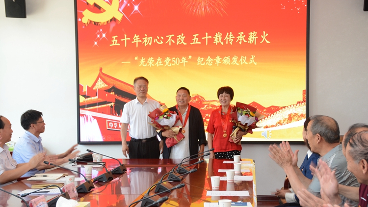 为进一步增强老党员的荣誉感、归属感,张志昌代表学校党委向党龄50周年的老党员代表陈淑芳、陈守荣颁发“光荣在党50年”纪念章,并送上鲜花和祝福,充分肯定和感谢老党员为学校发展作出的突出贡献。