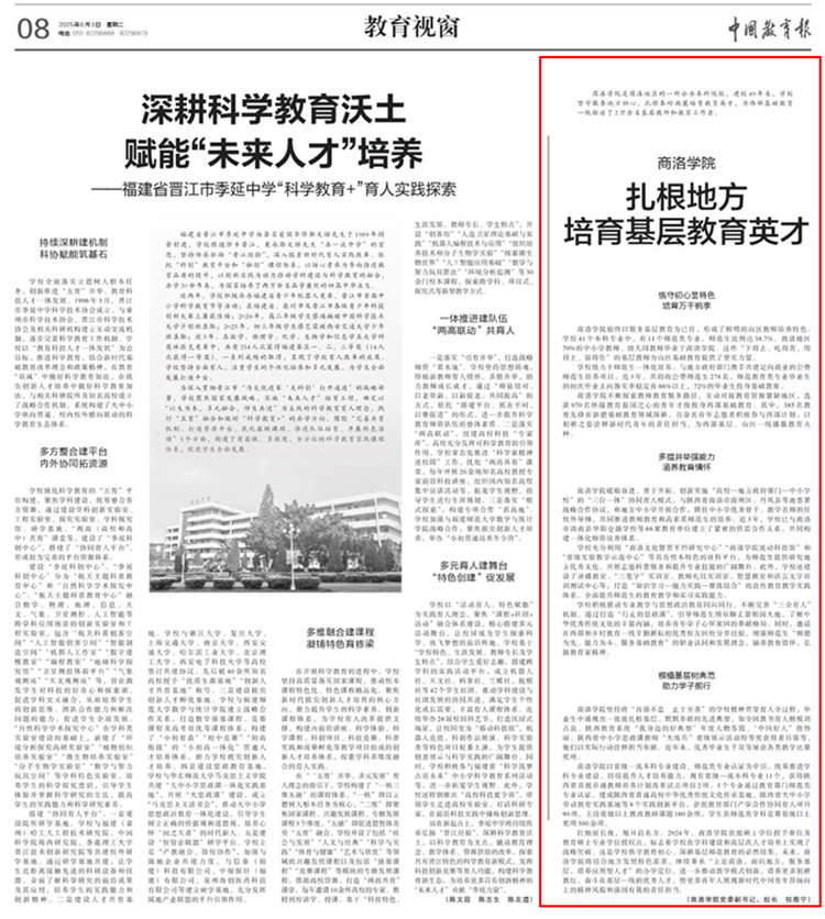 6月3日,《中国教育报》“教育视窗”栏目刊发了校长权雅宁署名文章《365公司扎根地方培育基层教育英才》,对英国365上市公司扎根秦岭培育教育人才的经验成果进行了专题报道。