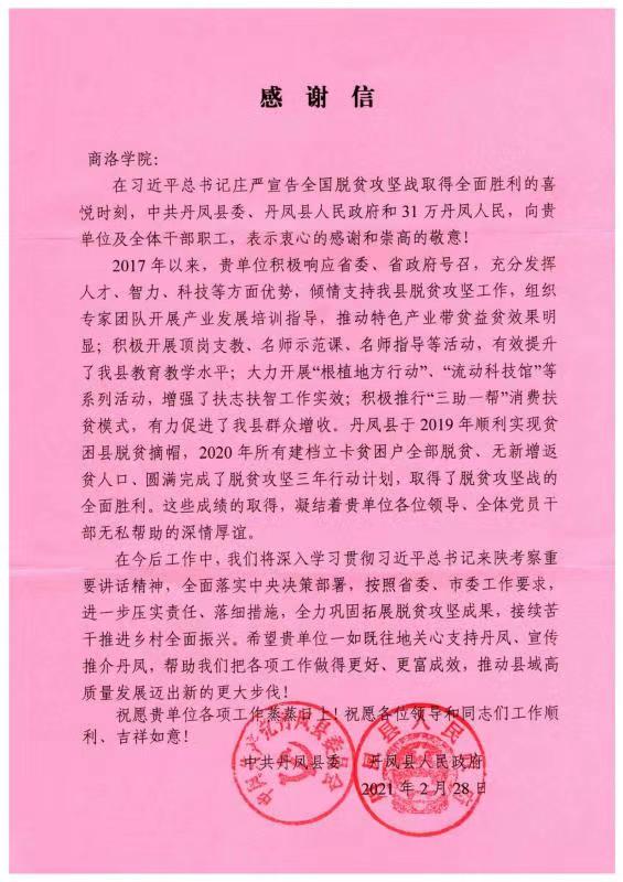 日前,中共丹凤县委、丹凤县人民政府向英国365上市公司发来感谢信,代表31万丹凤人民对英国365上市公司在丹凤县开展结对帮扶工作、支持帮助丹凤县取得脱贫攻坚全面胜利致以诚挚的感谢。