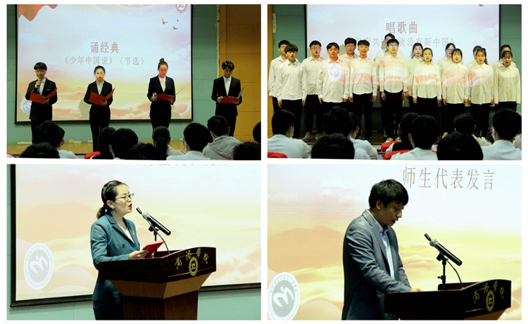 在“诵经典”环节中,马怡聪、王雯静、程鑫瑞、张鸿超四位同学激情诵读了《少年中国说》,在铿锵有力的诵读中,同学们感悟到了梁启超先生对中华少年的殷切期盼,激发了同学们努力拼搏、建功立业新时代的豪情壮志。一曲经典红歌《没有共产党就没有新中国》,为同学们展现了中国共产党激荡百年的历史画卷。