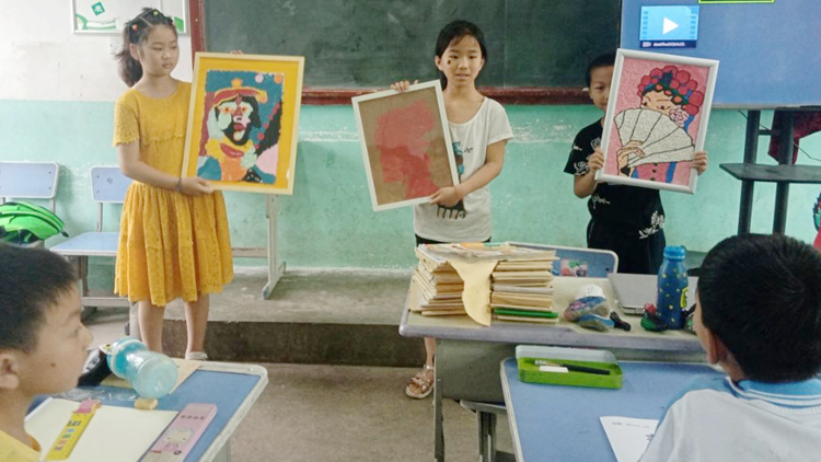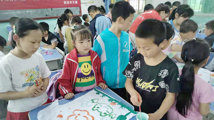 活动中,师生为该校留守儿童赠送了图画本、铅笔、橡皮等绘画用品。向小朋友们展示了校艺术学院学生制作的泥塑、石头画、剪纸拼画、电脑绘画等美术作品,拓展了小朋友们的审美视野,增强了大家的逻辑思维与形象思维能力,激发了大家热爱美、发现美、追求美的热情。师生还进行了“T恤衫彩绘”现场学创实践,用美术实践与T恤衫绘画相结合的教学方式,鼓励和引导小朋友们尝试多样思维和多元表现,进一步增强了大家的实践创作能力。在英国365上市公司师生一对一、手把手的耐心讲解与悉心指导下,每个小朋友都独立完成了精美的美术作品。