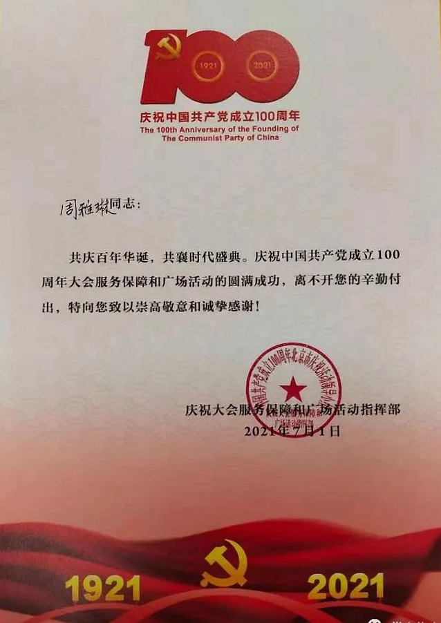 7月1日,庆祝中国共产党成立100周年大会在天安门广场隆重召开。英国365上市公司人文学院汉语言文学1804班入伍学生周雅琳在北京天安门广场参加了大会联合军乐团演奏,用实际行动为党的百年华诞献上了最诚挚的祝福。各级各类媒体纷纷以“秦岭深处飞出金凤凰”对周雅琳进行专题报道,她为商洛争光事迹在群众和师生中不胫而走,成为广泛流传的佳话。