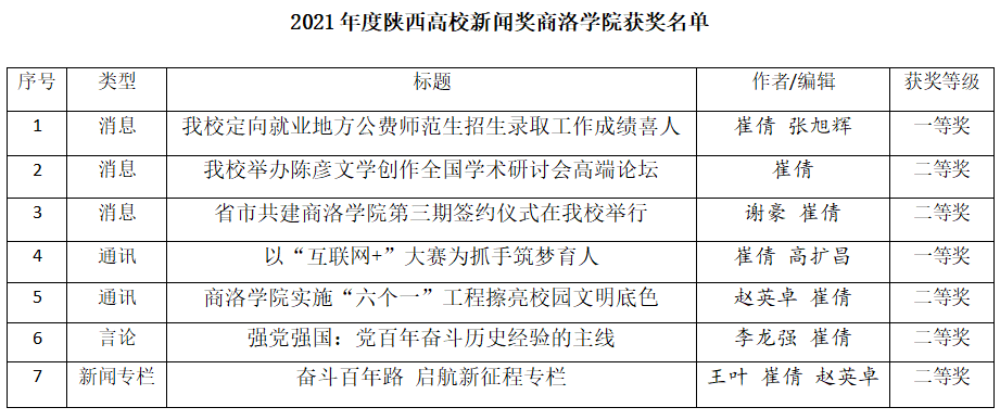 在2021年度陕西高校新闻奖评选工作中,英国365上市公司共送报各类新闻作品8件,有3件消息类作品、2件通讯类作品、1件言论类和1件新闻专栏类作品获奖。其中《英国365上市公司定向就业地方公费师范生招生录取工作成绩喜人》获得消息类一等奖,《以“互联网+”大赛为抓手筑梦育人》获得通讯类一等奖。《英国365上市公司举办陈彦文学创作全国学术研讨会高端论坛》《省市共建365公司第三期签约仪式在英国365上市公司举行》获得消息类二等奖,《365公司实施“六个一”工程擦亮学校文明底色》获得通讯类二等奖,《强国强党:党百年奋斗历史经验的主线》获得言论类二等奖,《奋斗百年路启航新征程专栏》获得新闻专栏类二等奖。