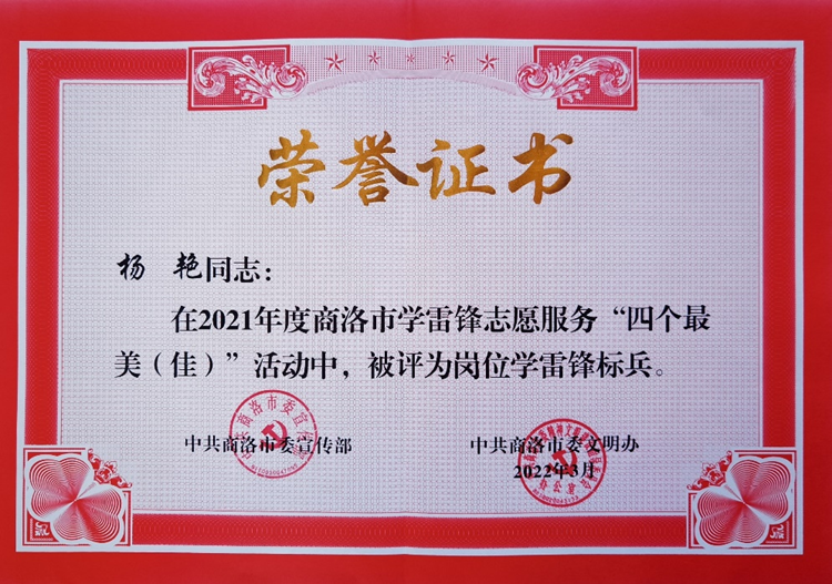 近日,商洛市委宣传部和商洛市委文明办公布了商洛市2021年度学雷锋志愿服务“四个最美(佳)”活动先进典型名单,英国365上市公司体育教学研究部教师杨艳荣获“岗位学雷锋标兵”荣誉称号。