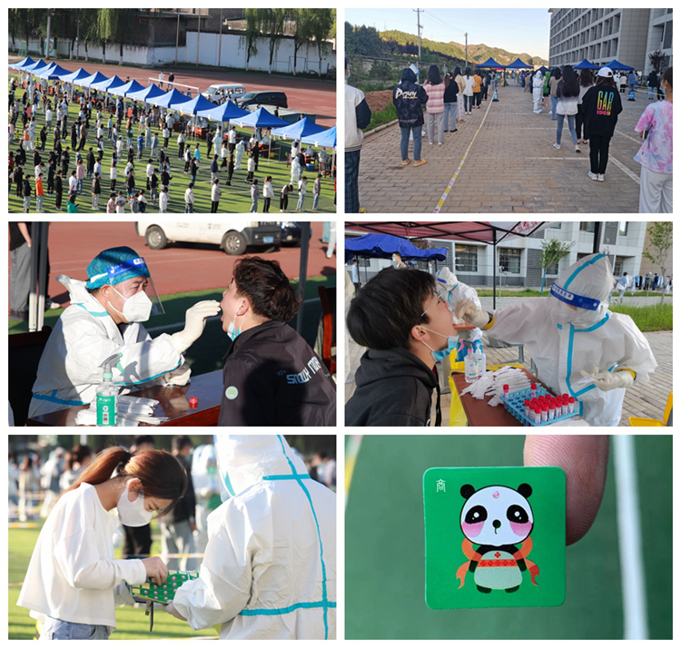 当天清晨,校领导亲赴现场指导工作。全体人员全程佩戴口罩,间隔一米整齐排队,携带个人健康码,分批次、分时段进入信息采集区和核酸采样区,配合医护人员完成采样工作,领取“秦岭四宝·熊猫贴”后有序离开现场。检测现场秩序井然,各项工作有条不紊。经历2小时20分钟,全体师生员工(含各部门临聘人员、环卫、食堂、超市、浴室、快递、打印、理发等从业人员、在校居住教职工家属及离退休职工)核酸检测采样顺利结束。