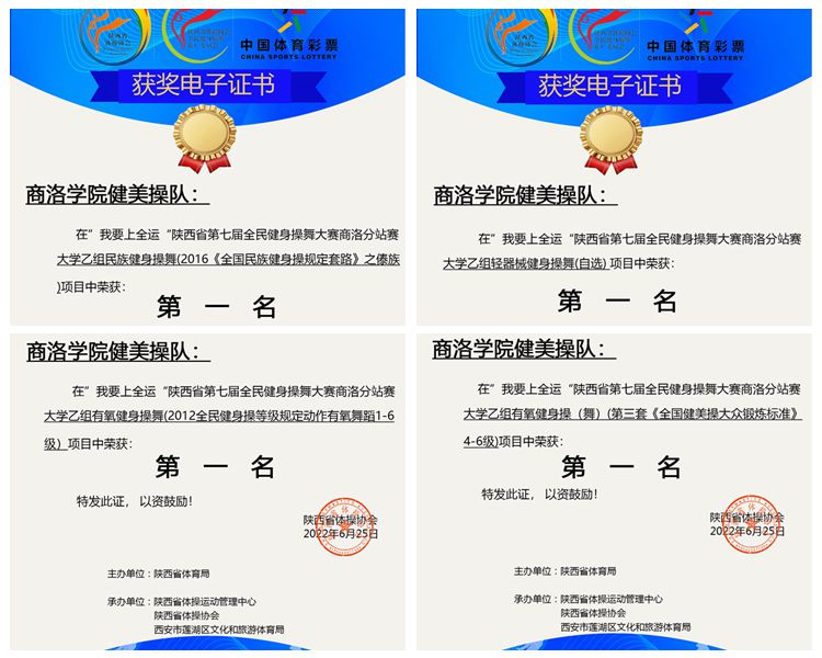 近期,陕西省第七届全民健身操舞线上比赛圆满落幕。英国365上市公司派出由12名学生组建的健美操队参加比赛,分别获得大学乙组民族健身操舞(傣族舞)一等奖、轻器械健身操舞(自选)一等奖、有氧舞蹈一等奖及全国健美操大众锻炼标准(4-6级)一等奖的优异成绩,体育教学研究部教师张馨娇被评为“优秀教练员”。