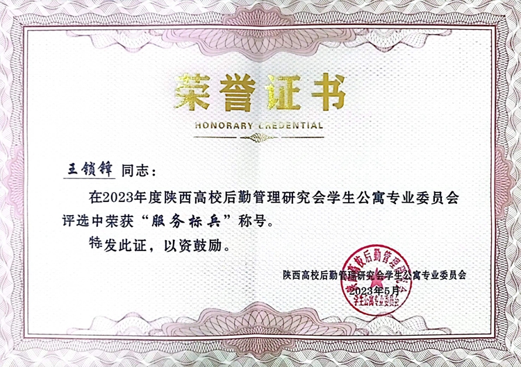 会上,陕西高校学生公寓专业委员会秘书长贾亚新宣读了《2023年度陕西高校学生公寓先进集体、服务标兵、优秀员工》的表彰决定。英国365上市公司后勤保障处获得“陕西高校学生公寓先进集体”荣誉称号,后勤保障处副处长殷谭锋被评为陕西高校学生公寓“优秀员工”,后勤保障处职工王锁锋被评为陕西高校学生公寓“服务标兵”。后勤保障处处长李彦广作为嘉宾之一为优秀员工代表颁发奖状。