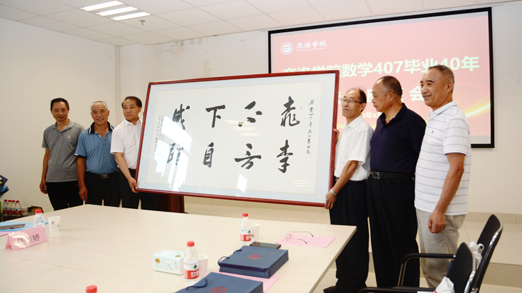 数学与计算机应用学院书记廉明向校友们介绍了数计学院的发展状况。校友工作处副处长任桂婷为校友们赠送了纪念品。校友代表向母校捐赠了书法作品,并向教师代表献上鲜花。