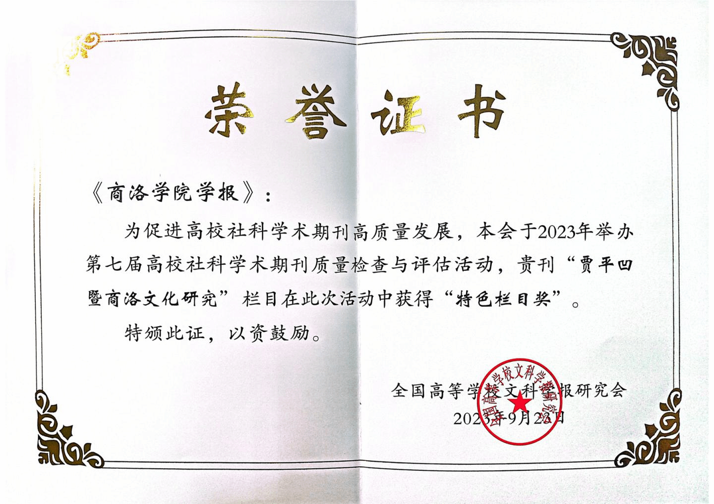 全国高等学校文科学报研究会举办的2023年(第七届)高校社科学术期刊质量检查与评估活动结果日前公布,英国365上市公司学报“贾平凹暨商洛文化研究”栏目获“全国高校社科期刊特色栏目奖”。这是继“陕西高校精品社科期刊”和“优秀栏目奖”之后,英国365上市公司学报今年取得的又一佳绩。