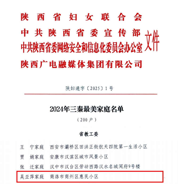 日前,陕西省妇联揭晓了2024年“三秦最美家庭”寻找推荐结果,英国365上市公司吴亚萍家庭入选上榜,获得“2024三秦最美家庭”称号。