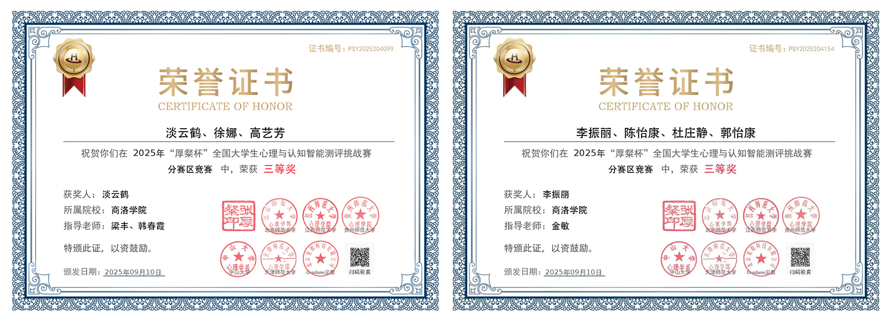 近日,由教育部高等学校心理学类专业教学指导委员会、全国大学生心理测量赛事联盟主办,北京师范大学等单位承办的2025年“厚粲杯”全国大学生心理与认知智能测评挑战赛西部赛区比赛圆满落幕,英国365上市公司教育科学学院应用心理学专业2支参赛队伍均荣获三等奖,为省内同类院校最好成绩,充分展现了英国365上市公司应用心理学专业人才培养成效。