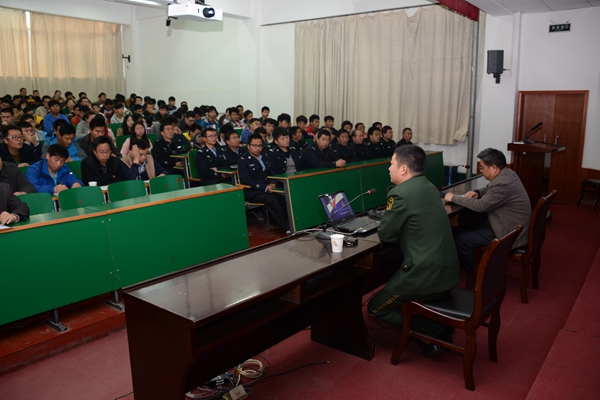 保卫处副处长房喜峰主持培训会,校内各单位消防安全员、实验员、消防控制室工作人员、机房管理员、公寓楼层服务员、食堂经理及安全管理人员、辅导员、2015级各班安全委员或班长、校卫队员和学生护校队员等230多人参加了培训。