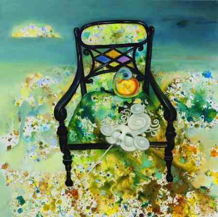 杨静的作品兼具油画的西方特质与艺术家个人的东方属性,多以意象风景为主,鱼、飞鸟、椅子、面具、鲜花常常成为画面中的主要视觉符号,意象化的表述方式是其绘画语言特点,独具视觉张力的画面背后蕴藏着或浪漫或神秘或抒情的艺术独白。《飞翔的鱼》系列作品承载着对“自然”“生命”“自由”的渴望与理想,“飞翔的鱼”穿梭于人间百象,描绘着在经历世事沧桑之后一颗满怀“游”“逸”的心。作品把中国传统文化中对庄子美学的研究与领悟融入到西方油画的创新当中,在中西文化的对撞中融汇出的独特浪漫气质是杨静油画艺术走出国门并被认可的实质。