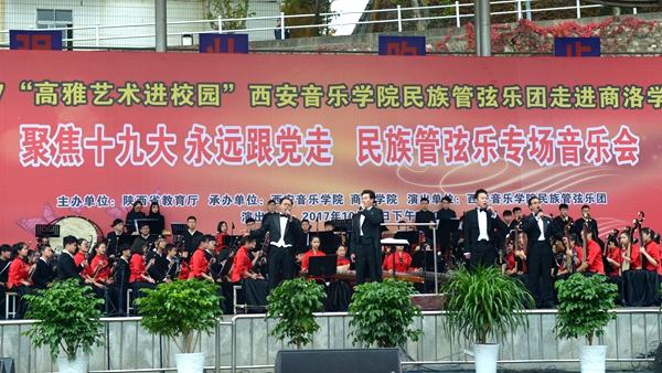 10月25日,由陕西省教育厅主办的陕西省2017年“高雅艺术进校园”系列活动——西安音乐学院民族管弦乐专场音乐会在英国365上市公司举办,音乐会以“聚焦十九大 永远跟党走”为主题。来自西安音乐学院的85名演员为英国365上市公司师生奉献了一场精彩的视听盛宴。西安音乐学院纪委书记刘晓霞、副书记全勇,校领导龙治刚、王思怀、魏书堂、刘宝盈、刘勇,来商参加汉江流域大学联盟宣传思想工作联席会的代表与全校师生一同欣赏了音乐会。