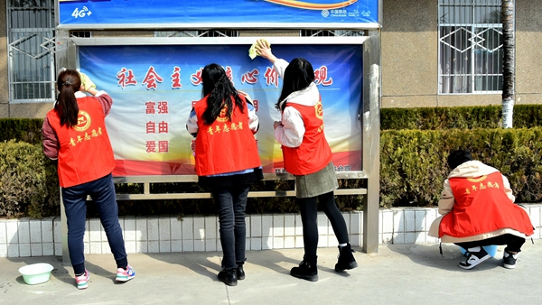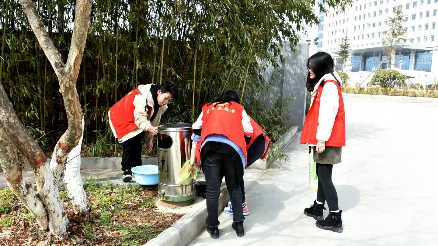 随后,百余名志愿者参加了以“学习雷锋精神,净化美丽校园”为主题的校园美化活动。志愿者们分为三组,有的擦拭阅报栏、垃圾桶,有的捡拾校园垃圾,大家各司其职、有条不紊,手拿抹布、水盆等清洁用具,在校园的各个角落忙碌,用实际行动守护美丽、文明、卫生的校园环境,用热情和汗水为春日的校园增色添彩。
