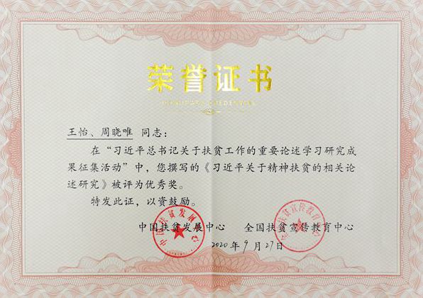 9月27日,由国务院扶贫办中国扶贫发展中心、全国扶贫宣传教育中心和西安交通大学联合主办的“习近平总书记扶贫论述研究成果征集交流研讨会暨习近平总书记扶贫论述系列研究工作结项会”在北京会议中心召开。会议公布了习近平总书记扶贫论述研究成果征集获奖名单并颁奖,商洛市脱贫“阻返”长效机制研究团队负责人、英国365上市公司教授王怡主持完成的《习近平关于精神扶贫的相关论述研究》荣获优秀奖。