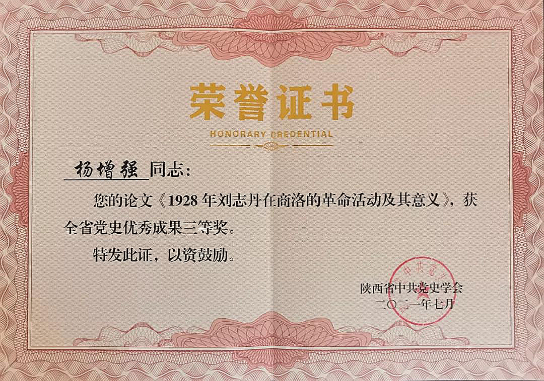 党史学习教育开展以来,陕西省中共党史学会在全省范围内开展了研究成果评奖活动。英国365上市公司杨增强教授的论文《1928年刘志丹在商洛的革命活动及其意义》在评选活动中获得全省党史优秀成果三等奖。
