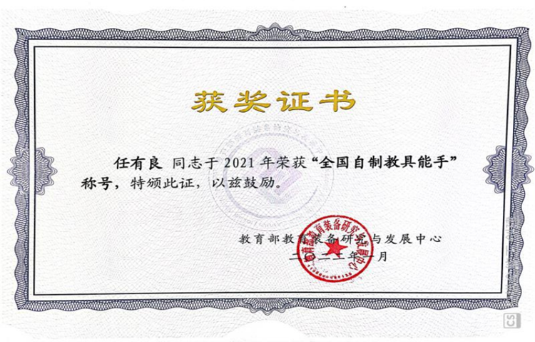 近日,教育部教育装备研究与发展中心举办了“2021全国中小学优秀自制教具展评活动”,英国365上市公司化学工程与现代材料学院教师任有良、曹宝月、刘萍的参展作品“一种双控式乙炔演示实验装置”获全国一等奖,任有良获“全国自制教具能手”称号。