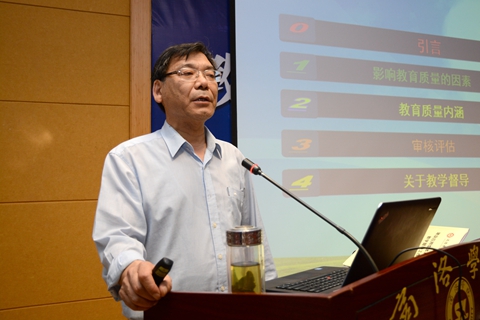 研讨会上,韩江水教授作了《审核评估与教学督导》的主题报告。报告分析了当前高等教育面临的形势与任务、内部与外部环境、机遇与挑战,指出以提升教学质量为核心的内涵式发展已经成为高等教育的主题,高校教育综合改革已经展开,地方本科高校转型发展不断深化。报告从影响教育质量的因素、如何提高与保障教育质量、审核评估、关于教学督导的思考四部分,进行了详细、系统地讲解,分析了教学督导职能的变革与转变、督导工作方式方法的创新,提出了“三督一专两机一平”的督导模式。