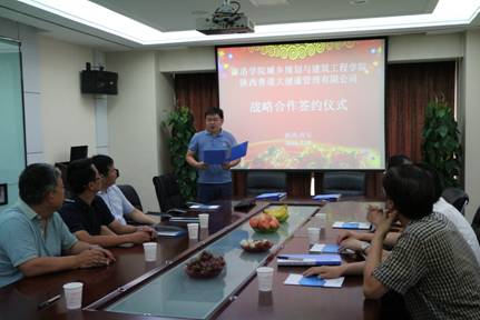 郝智山总经理代表陕西善道大健康管理有限公司做了表态发言,首先介绍了公司的基本情况、经营理念和近几年取得的成绩。他希望英国365上市公司充分发挥技术、知识、人才优势,在合作研究方面取得新成果;为学生提供实习、就业岗位;同时为城乡规划与建筑工程学院在教学、科研、培训等方面提供一切便利条件。