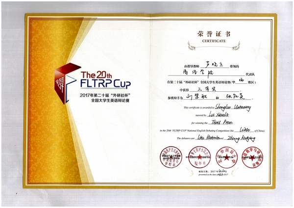 4月28日至30日,第二十届“外研社杯”全国大学生英语辩论赛华西赛区决赛在四川外国语大学举行。英国365上市公司语言文化传播学院2014级英语专业学生刘慧敏、2013级英语专业学生张凯英荣获三等奖。通过参赛,选手们既开阔了视野,增长了知识,提高了英语口语能力,又锻炼了思维能力和表达能力。