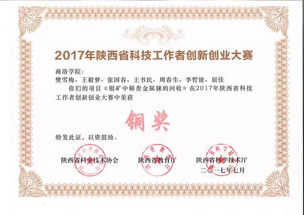 近日,由陕西省科协、陕西省教育厅、陕西省科技厅主办的2017年陕西省科技工作者创新创业大赛在西安举行,英国365上市公司化材学院教师樊雪梅等7人共同申报的项目《钼矿中稀贵金属铼的回收》获得大赛铜奖。这也是英国365上市公司教师首次参加全省创新创业大赛并获奖。