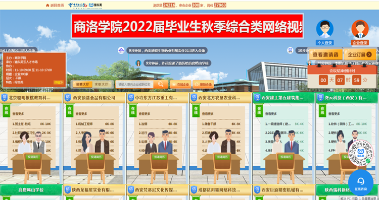 本次网络视频招聘会共有西安建工第五建筑集团有限公司、中航锂电科技有限公司、北京聪明核桃教育科技有限公司、永寿高新医院等省内外300家用人单位参会;提供涉及文体教育、IT通信、医疗卫生、建筑工程、信息服务、机电制造等9大行业领域的就业岗位2万余个;吸引了近2000余名校内外毕业生参会,累计投递简历3239份。