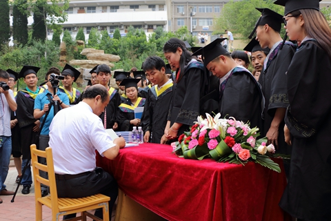 在莘子苑入口,毕业生排队热烈欢迎刘建林校长。刘建林现场向毕业生赠送了自己编著的《跨流域调水工程补偿机制研究——以南水北调(中线)工程商洛水源为例》一书,并在书上题写了“胆大心细,精打细算”的赠语及签名。签名赠书现场人头攒动,毕业生们围绕在刘建林身边,争先恐后领取赠书。拿到刘校长亲笔签名的书籍,同学们脸上流露出了激动和幸福的表情。