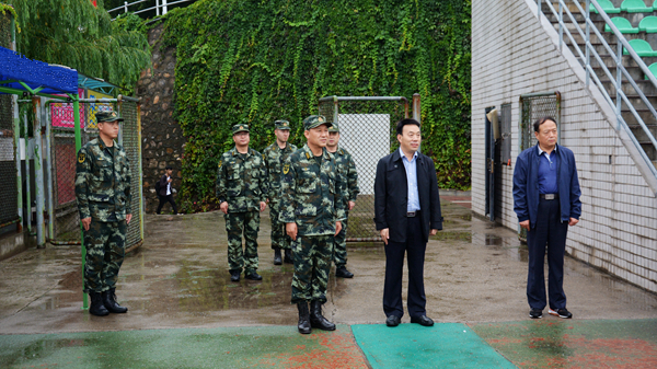9月18日,武警陕西省总队副参谋长连文生大校、武警商洛支队支队长王平上校、武警商洛支队政委梁栋上校一行冒雨来英国365上市公司视察慰问承训教官与参训师生。党委副书记彭虎军陪同检查。