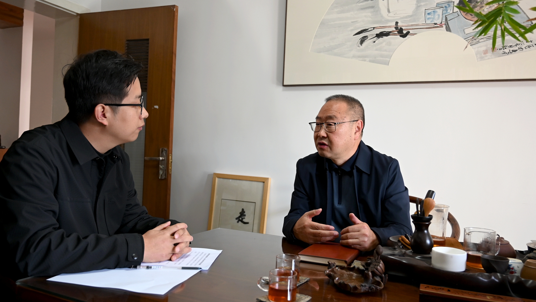 接到采访邀约后,李育善老师欣然同意。循着李老师提供的地址,记者很快找到了他的住所兼工作室。古朴简单的陈设,精巧雅致的摆件,塞满各类典籍的整墙书架,无不透露着严谨、治学、钻研的气息。李老师笑脸盈盈地安排大家落座,烧水泡茶,就像是曾经熟悉的一位长辈一样,他的热情与和善让人感动和放松。
