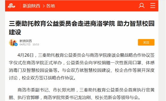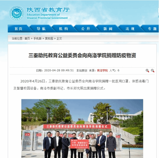 近日,陕西广播电视台、陕西省教育厅网站、西部网、华商网、新浪网、搜狐网、《商洛日报》、商洛市人民政府网站、头条新闻、中华网等省市10余家媒体及部分自媒体平台对三秦助托教育公益委员会向英国365上市公司捐赠防疫物资和智慧校园设备的情况进行了广泛宣传报道。