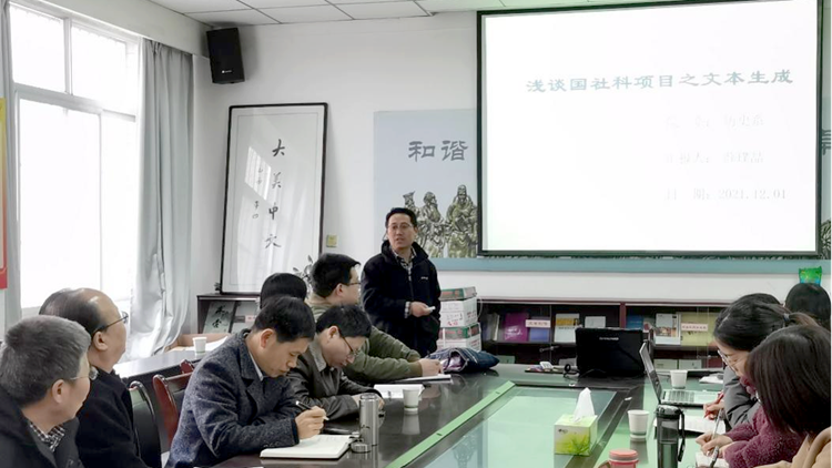 薛璞喆博士以《浅谈国社科项目之文本生成》为题,从历史学视角,结合实际案例,从项目选题、文本书写和学术体悟三个方面详细介绍了项目申报的思考过程和成功经验。他建议,项目研究要坚持问题导向,申报文本的书写要“以问题带动内容,以内容深化问题”,在论述中不断细化问题,强化选题主旨,强调选题意义;要扎实学术基础,自觉提升学术素养和创新能力;要增强团队意识,坚持虚心涵味、切己体察,在互动交流中学习先进经验、汲取智慧力量。