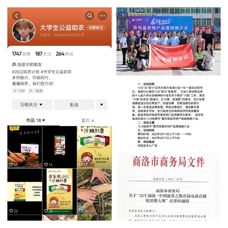 加强技术帮扶,推动县域经济发展。学院根植地方“电子商务助力数字乡村建设与县域产业结构升级团队”围绕自身学科优势,以丹凤县2022年“6·18电商节”暨农特产品展销推介会为契机,结合“经管院首届直播大赛”的举办,充分利用在校师生在短视频运营、电商直播的专业积累,助力如陕西商於本草中药材有限公司、丹凤葡萄酒厂等丹凤县特色农产品经营企业开展直播销售,形成一批具有一定人气和粉丝量的电商助农类运营账号,借助电商营销手段、模式充分促进活动引导生产、衔接供需、引领消费的积极作用,活跃城乡市场,促进丹凤电子商务经济的高质量发展。