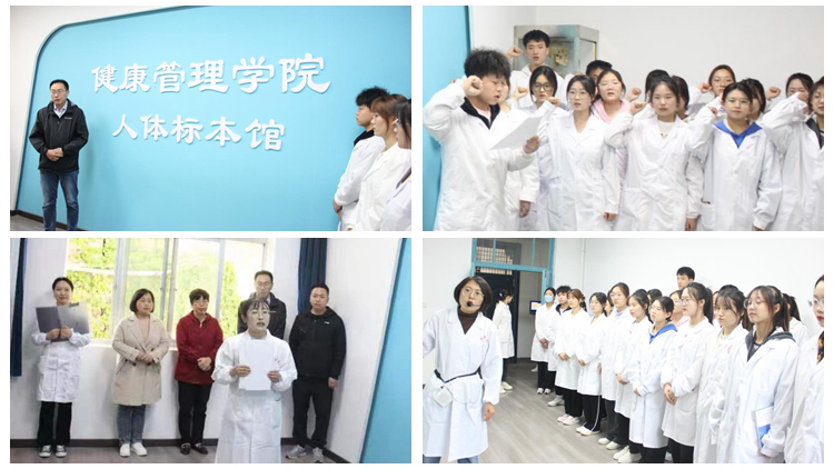 护理系系主任贠航从多方面对学院人体标本馆作了介绍,实验室中心主任陈颖宣读了《人体标本馆进馆须知》,护理系教师王涛带领与会师生详细参观了人体标本馆,学生代表胡虔熙带领全体学生重温了医学生誓言。
