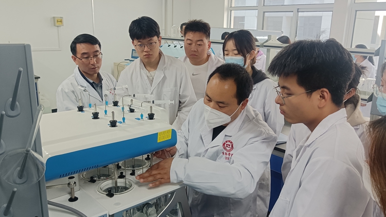 随后,王学军教授和周绪华老师带领学生进入实验室,开展甲硝唑片溶出度的测定实践。在实操的每一个环节,两位教师悉心指导,学生自主实验的同时与教师积极互动,详细讨论仪器操作的注意事项、出现的问题和解决的办法,以及观察的指标、数据的收集与计算、结果的判定等实验课程内容。