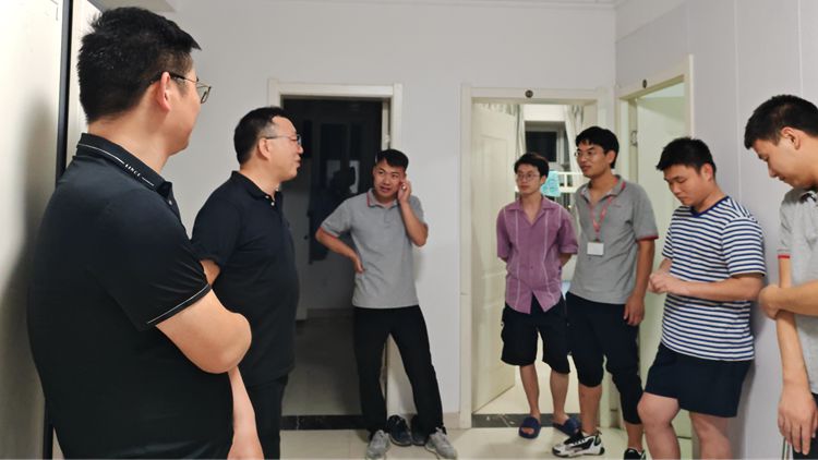 袁训锋一行深入实习生宿舍和工作区,了解学生住宿、饮食、学习以及实践教学条件建设情况,访谈实习岗位学生、带队教师与企业导师,并调研学生实习内容与学习情况、企业导师对学生指导情况以及对学院实习工作的建议。
