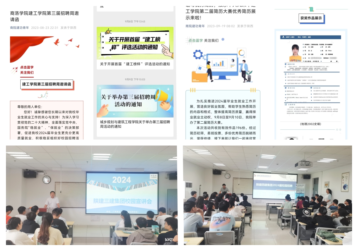 早谋划,做好就业动员与帮扶。7月10日,建工学院成立了以学院党委书记杨小锋为组长的2024届就业工作专班,制定工作方案,明确责任目标,在分析研判建筑类行业需求情况的基础上,一是设计和发布建工学院第三届招聘周邀请函,主动邀请社会用人单位进校召开宣讲会;二是分专业分学制做好全体毕业生就业意向调查数据采集,明确就业方向;三是召开2024届毕业生就业动员会,所有毕业班辅导员及班主任及时进班召开就业主题班会,从建筑类专业就业形势特点、树立正确的就业观念、求职准备、心理辅导、就业安全等几个方面为毕业生解答疑惑;四是建立家庭经济和就业困难毕业生帮扶台账,成立帮扶小组,学院班子成员主动带头联系帮扶,主动开展就业助推暖心服务;五是同步举办第三届简历设计大赛,以赛促就业,196名毕业生提交简历,评选出10份优秀简历进行展示,引导学生设计完善简历为参加招聘宣讲会做充分准备;六是教师主动帮扶学生做好职业规划,城乡规划专业马骁等老师主动指导学生设计简历、开展学生面试应聘模拟等,助力学生早就业。