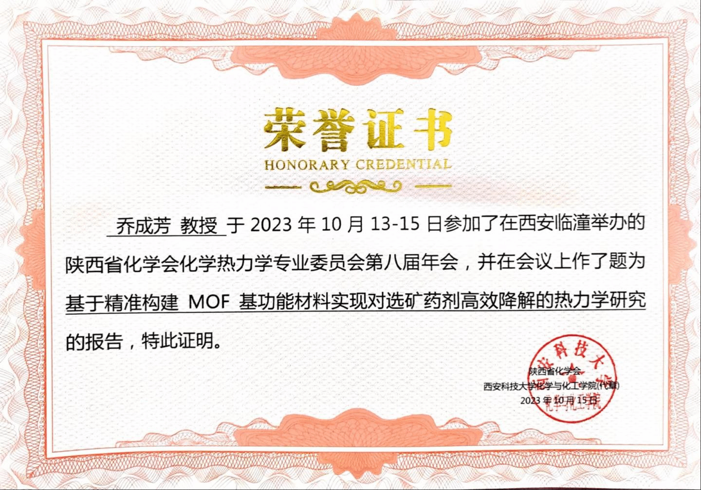化材学院副院长乔成芳教授作了题为“基于精准构建 MOF 基功能材料实现对选矿药剂高效降解的热力学研究”的大会报告,分享了“MOF基功能材料热化学”团队在尾矿库区废水中金属离子的检测、选矿药剂的高效降解的相关工作,并与参会专家进行交流。