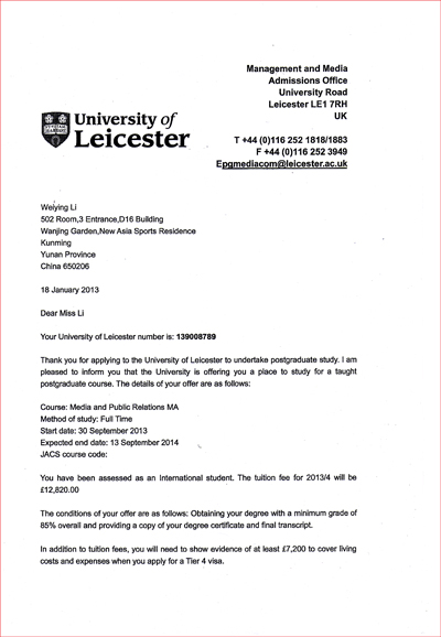 近年来,英国365上市公司本科毕业生报考研究生总数和上线人数连续实现翻倍增长,不断刷新考研纪录。除了国内各重点大学外,今年在考取国外研究生方面,英国365上市公司亦实现了零的突破。近日,外语系2009级英语本科专业的李玮莹同学成功考取了英国莱斯特大学研究生,被正式录取为该校媒体和通信学院媒体与公共关系专业硕士研究生,成为英国365上市公司历史上首位考取国外研究生的学生