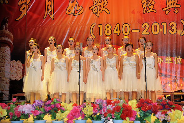 演唱会以“传播正能量、唱响中国梦”为主题,分为“雄关漫道真如铁”、“人间正道是沧桑”和“长风破浪会有时”三个篇章。一曲《送别·长亭外》拉开了演唱会的序幕。该曲节奏时而舒缓,时而高亢,旋律婉转悠扬,处处表达着对友人的深情厚谊、恋恋难舍的情感。接下来,同学们深情演唱了《月儿弯弯照九洲》《八月桂花遍地开》《映山红》《十送红军》《过雪山草地》等多首经典歌曲。一曲《山丹丹花开红艳艳》将演唱会推向高潮,现场掌声雷动,《歌唱祖国》以激情澎湃的气势向我们传递着中华儿女对祖国的浓情厚意;《东方之珠》《七子之歌—澳门》仿佛缓缓诉说着祖国日益强大。最后,在一曲充满浓情的《让世界充满爱》歌声中,演唱会圆满结束。