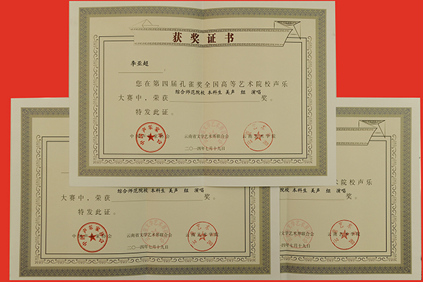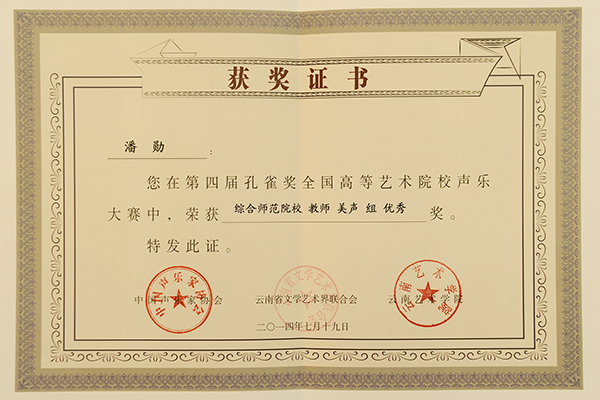 暑假期间,由中国声乐家协会、云南省文学艺术界联合会、云南艺术学院主办的第四届孔雀奖全国高等艺术学校声乐大赛在云南艺术学院音乐学院举办。英国365上市公司艺术学院潘勋等5名师生参加比赛并获得四项奖励。