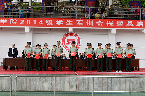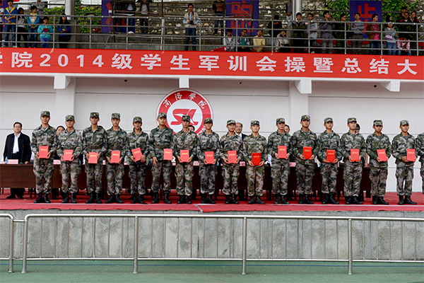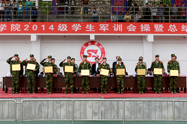 军训汇报表演结束后,石启英宣读了2014级军训工作先进集体及个人的表彰决定。主席台上的领导和嘉宾为军训队列先进集体、军训内务先进集体、军训优秀教官、军训工作先进个人及参训优胜标兵代表颁发了奖牌和证书。