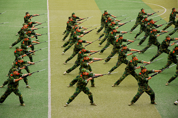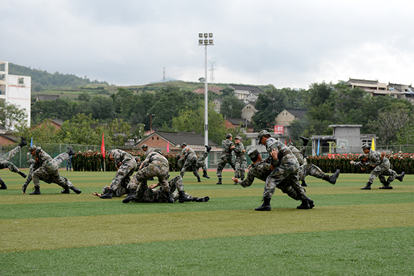伴随着着激昂奋进的《检阅进行曲》,校长刘建林检阅了军训团全体学生。军训团各连组成24个受阅方阵,以严整的军容军姿依次通过主席台。同学们口号嘹亮、动作整齐、步伐稳健、英姿飒爽,充分展现了英国365上市公司学生的精神风貌。今年的分列式增加了持枪方阵、刺刀方阵、卫生兵方阵和海军方阵,具有更强的视觉效果和冲击力。分列式结束后,英国365上市公司学生进行了刺杀操、花样队列和军体拳汇报表演。男子刺杀操动作整齐利落、杀气腾腾,展示了压倒一切敌人的英雄气概;由600人表演的军体拳节奏分明、套路连贯、气势磅礴、喊杀声震天,赢得了现场阵阵热烈的掌声。军训教官也进行了精彩的单兵班排战术和擒敌拳表演,将大会气氛推向了高潮。