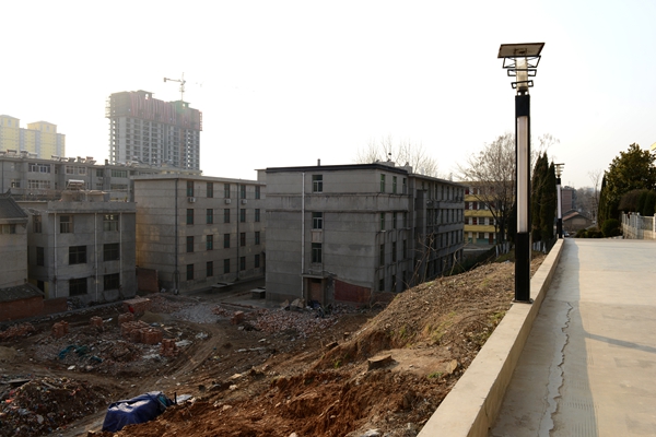 为了使图书馆正门前道路畅通、东西两院径直连通,两楼前边界至少要前移10多米,占地面积共计4.9亩。4.9亩面积虽不大,但却处处是咽喉要地。校长刘建林、纪委书记王思怀多次与市上相关部门联系洽谈,基建处多次配合商州区城关办事处赴东店子社区居民家中洽谈,1月20日学校与所涉及的3户15人达成协议,划定了边界权属,开始平整土地、修筑围墙。
