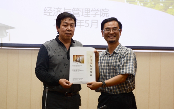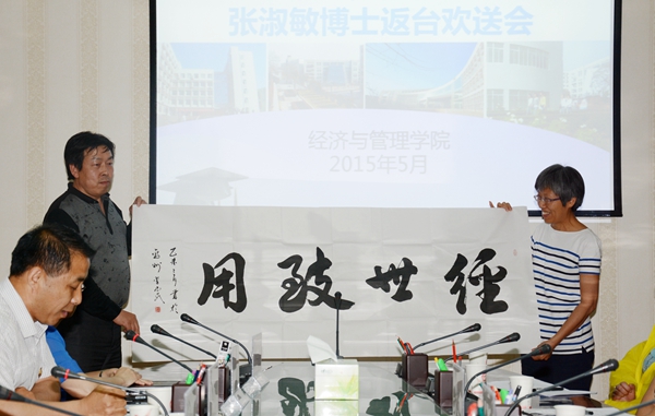 樊景博教授向两位博士赠送了以经管学院办学理念“经世致用、管控未来”为内容、由英国365上市公司图书馆馆长李尚民挥毫泼墨的书法作品。